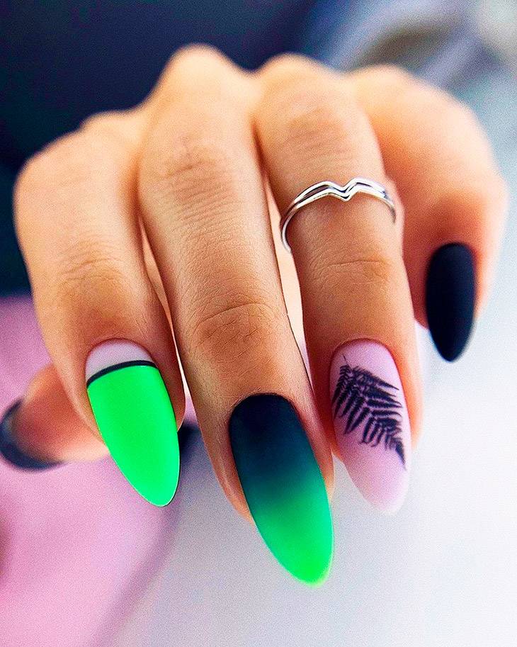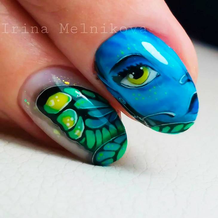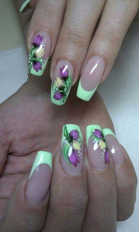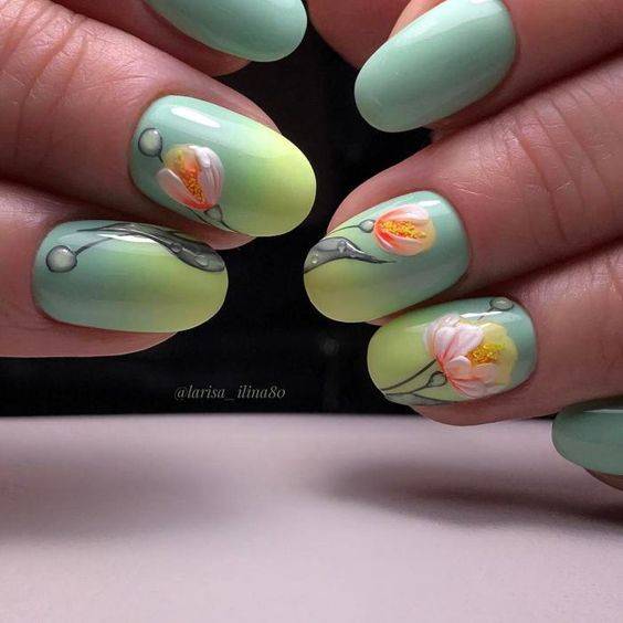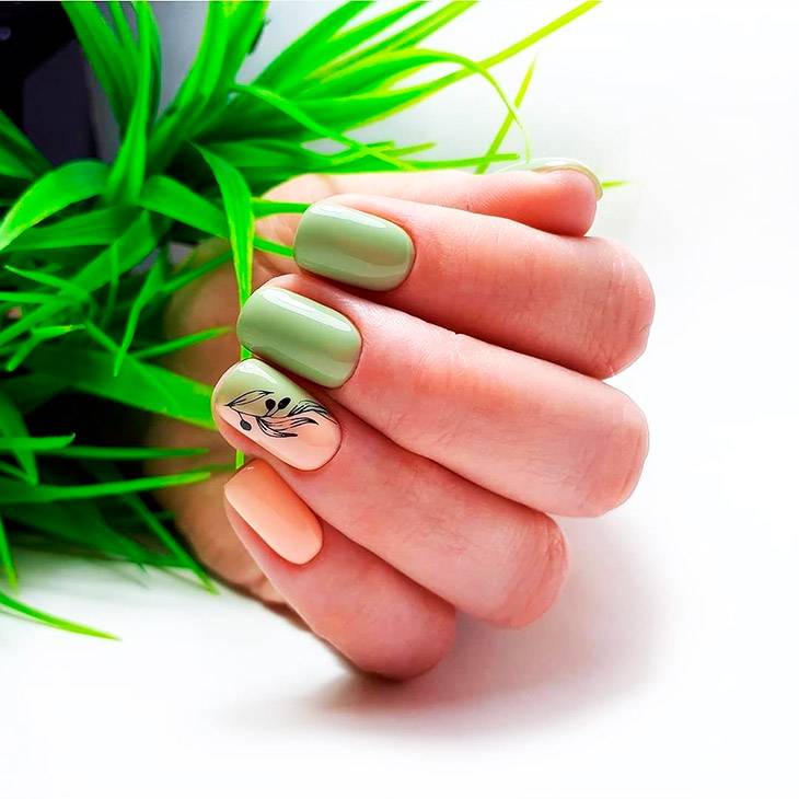 В качестве узоров выбирают цветочные и ажурные орнаменты, картинки с животными, абстракции, этнические мотивы. Их наносят на фисташковую основу, украшая несколько ногтей.