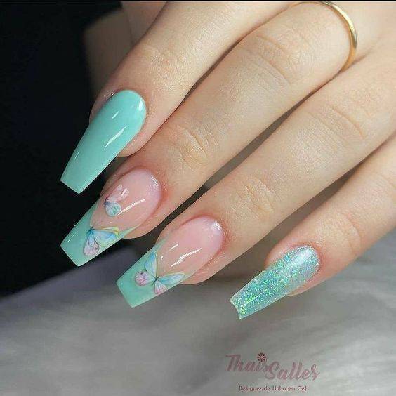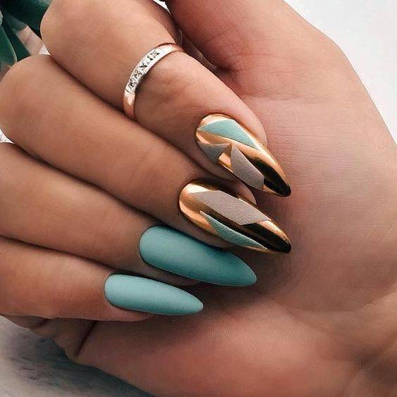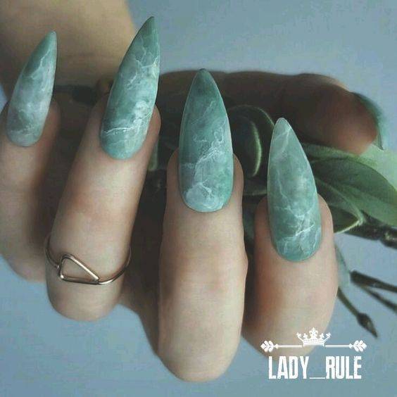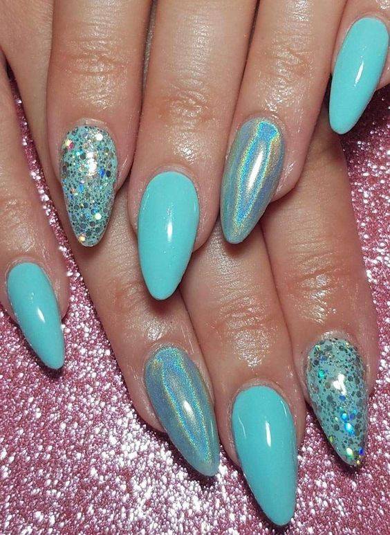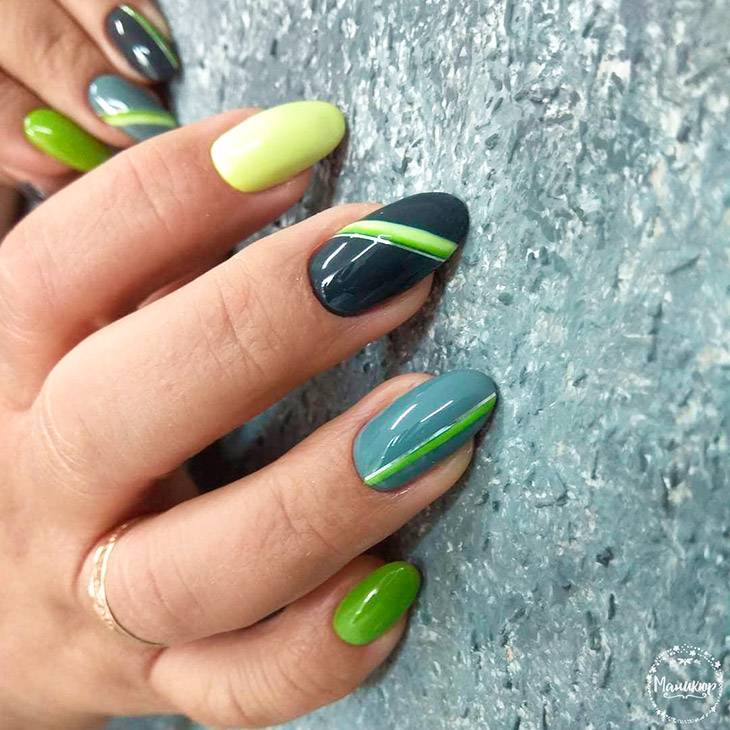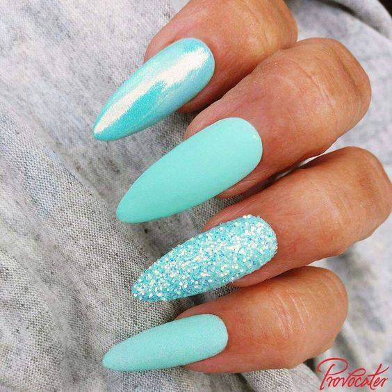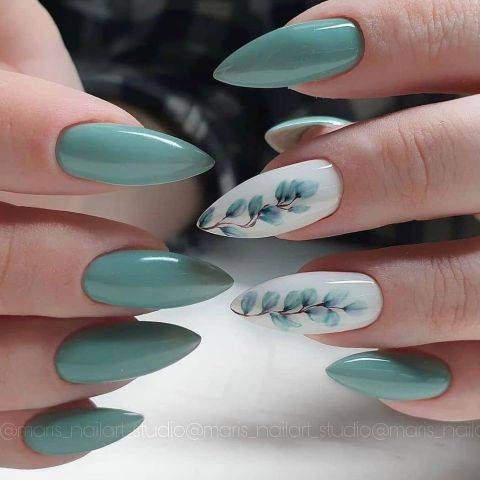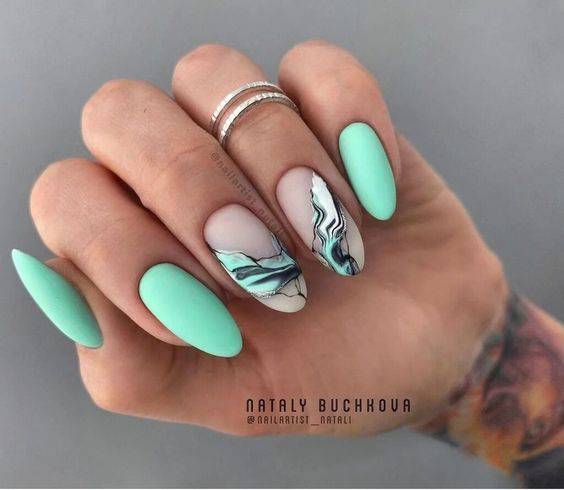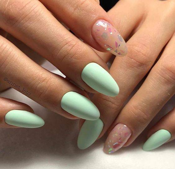 Мятный дизайн ногтей замечательно смотрится на любой длине и форме ногтей. На острых ноготках специалисты рекомендуют комбинировать гель-лак с другими тонами.