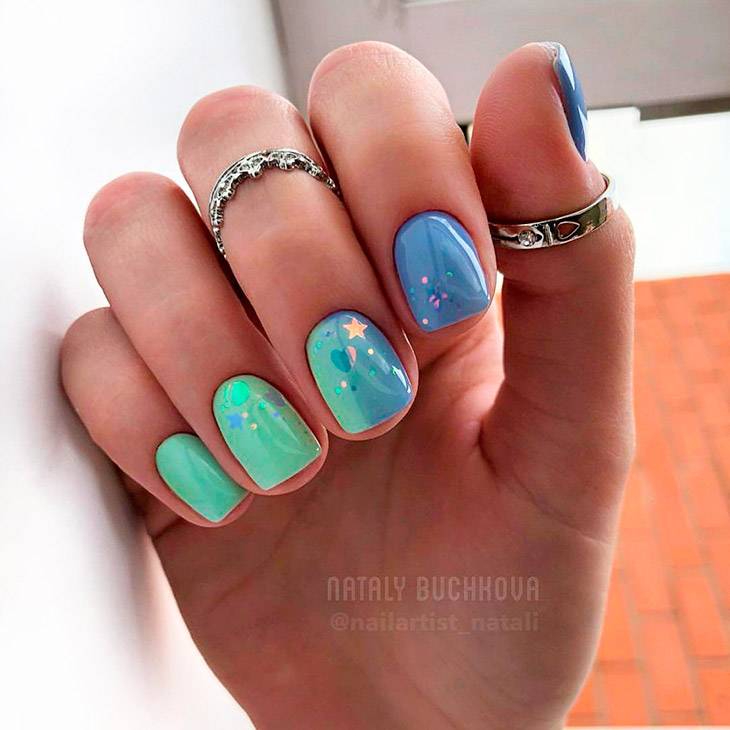 В мятном маникюре редко применяют насыщенный синий, гораздо чаще встречается светло-голубой. Как правило, его используют для создания омбре, иногда сочетают в геометрической композиции.