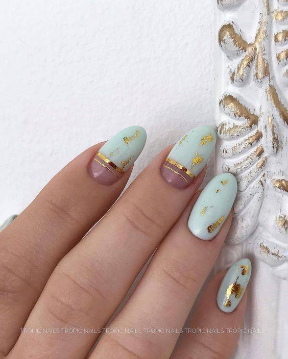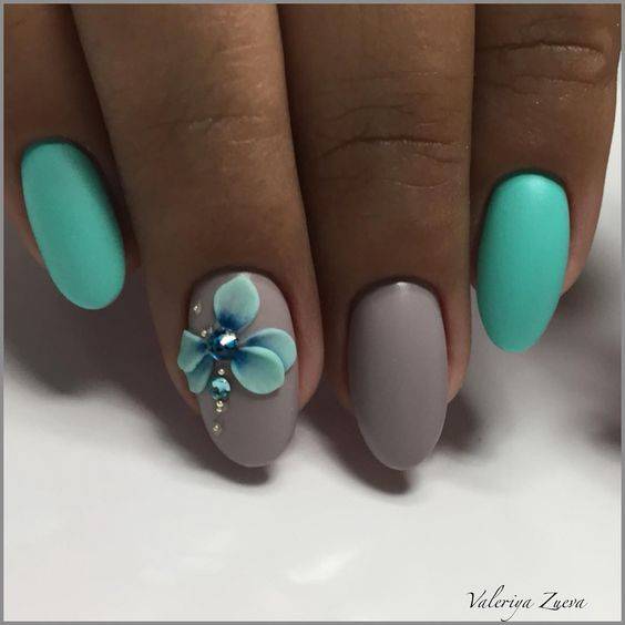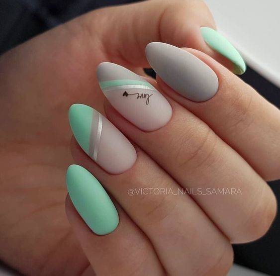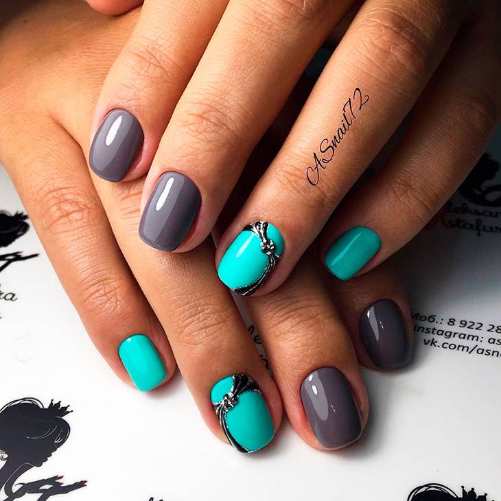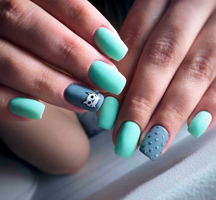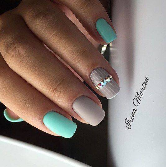 Серый используют преимущественно в матовом варианте. Мятные ногти украшают единичными стразами, белыми принтами, а также золотистыми элементами, например, фольгой.
