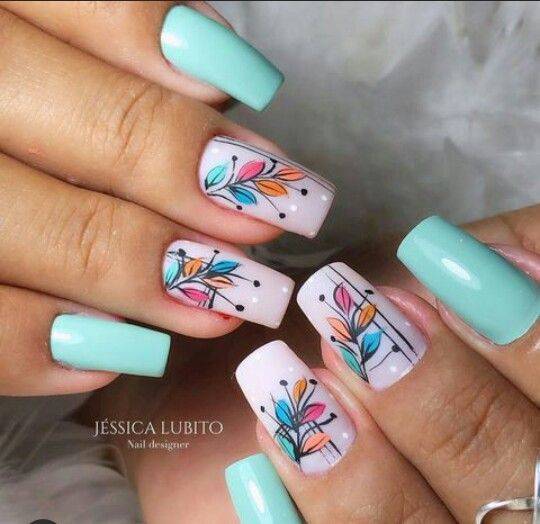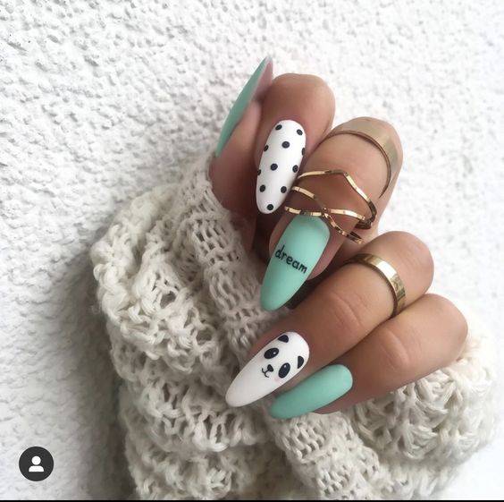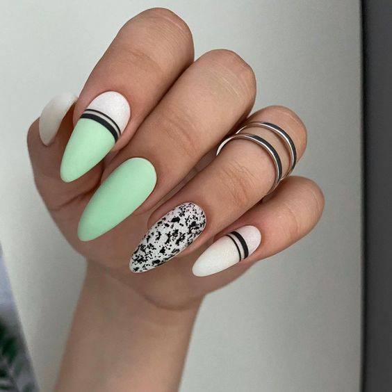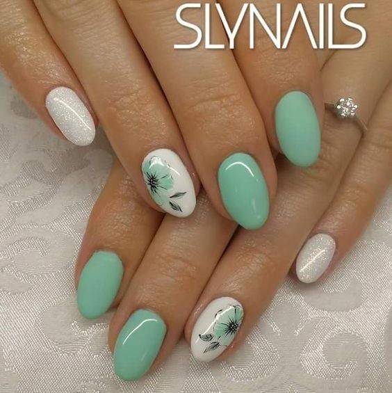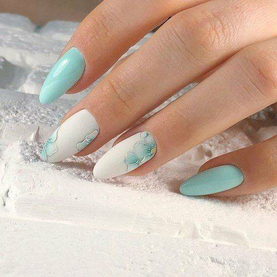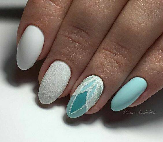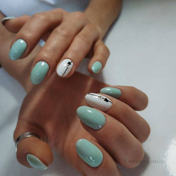 Как мы уже говорили, контрастное сочетание белого с мятным — одно из самых популярных. И вариантов маникюра, которые можно создать, сотни. Показываем наши любимые.