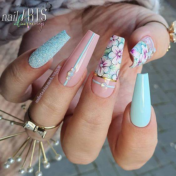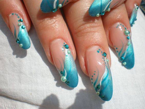 Длинные ногти могут украсить рисунки, узоры, стразы, камни, эффектным будет французский нейл-арт или использование втирки. При выборе объёмного дизайна можно сбалансировать его, разбавив другими цветами.