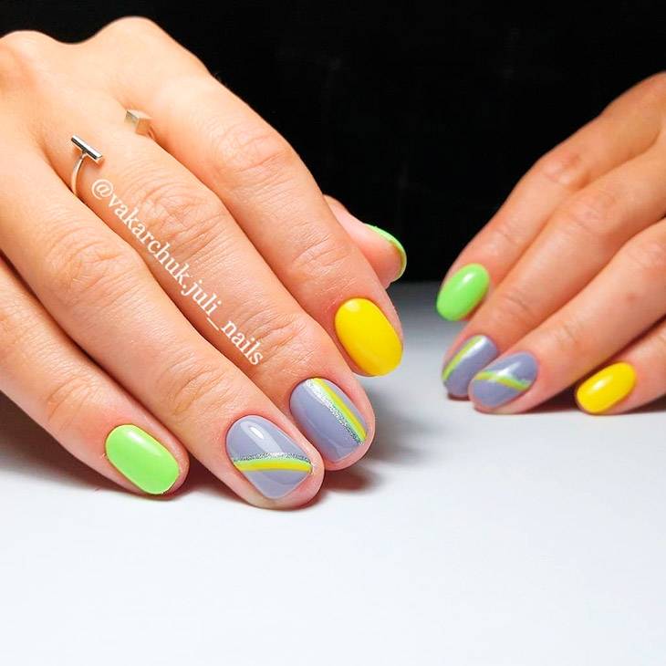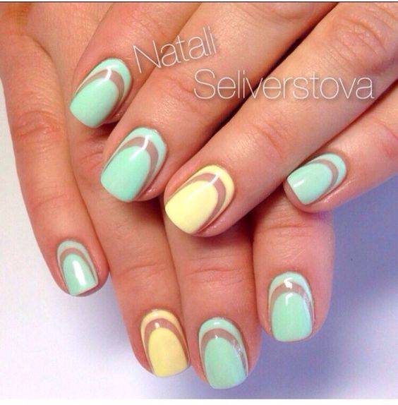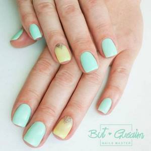 Как правило, в желтый окрашивают один-два ногтя, чтобы разбавить мятный цвет ногтей. Дополнить маникюр можно небольшим количеством блесток у основания, фольгой, геометрией.
