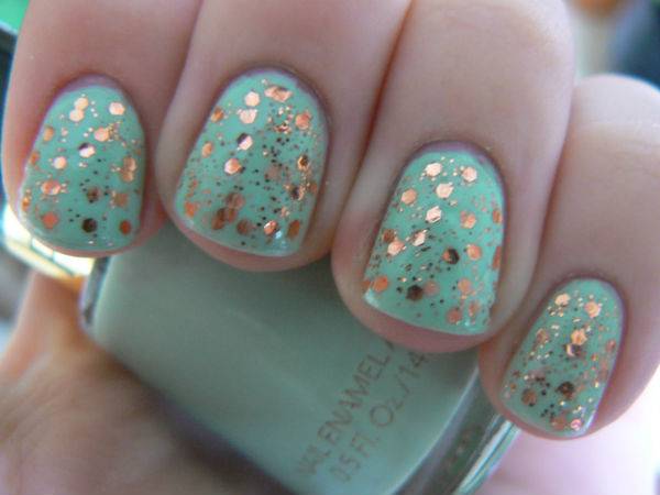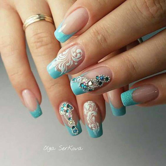 Покрытие ногтей лаком мятного цвета разрешено осуществлять не только для ежедневного выхода на люди, а еще на свадьбу. Для этих целей в процесс могут быть задействованы стразы, кристаллы, бусины, ленточки, украшение кружевом. Не нужно обязательно наносить блестящие элементы на все ногти, вполне хватит одного пальца. Этот вариант пастельного дизайна будет выглядеть красиво, аккуратно и стильно. Самым популярным нейл-арта станет френч, в котором основной служит шеллак цвета морской волны, а кончики покрывают лаком с глиттером.