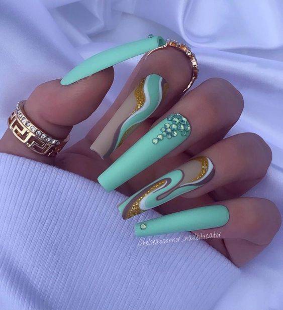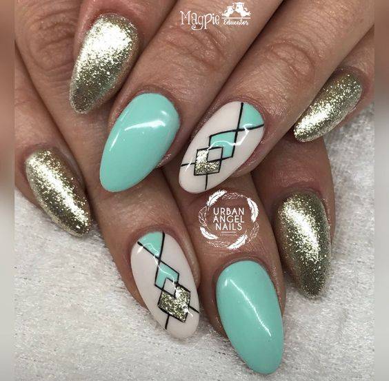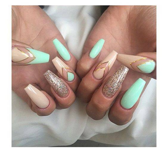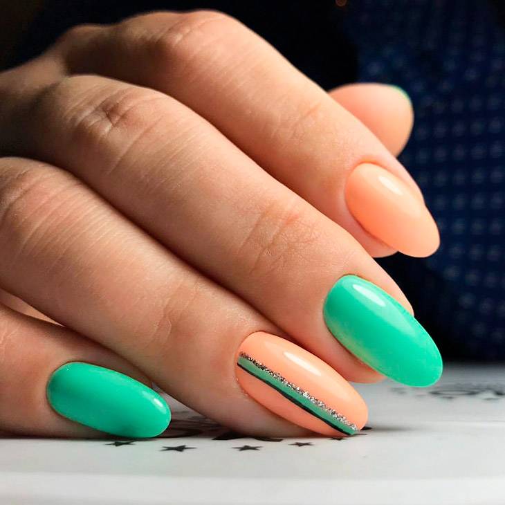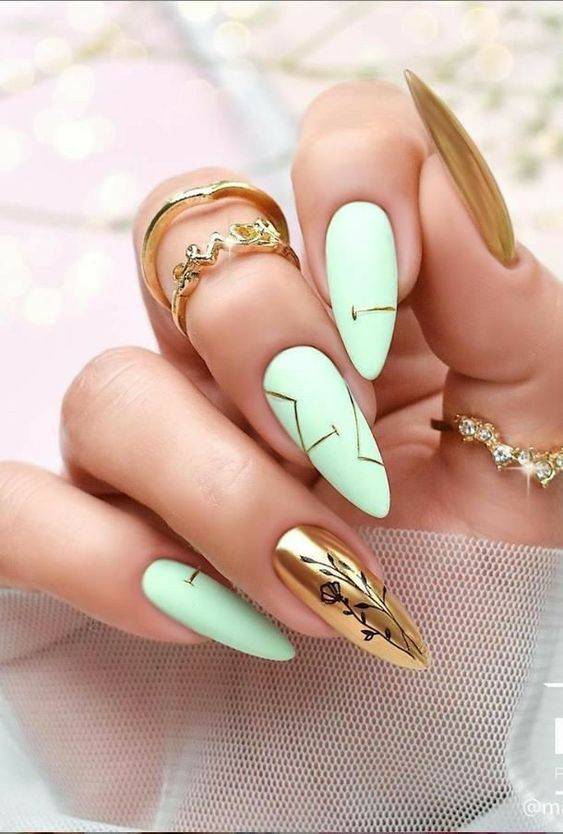 При использовании яркого цвета в дополнение к основному мятному покрытию, получается веселый молодежный дизайн, поднимающий настроение. Для вечернего варианта маникюра можно использовать сочетание оттенка мяты с золотом.
