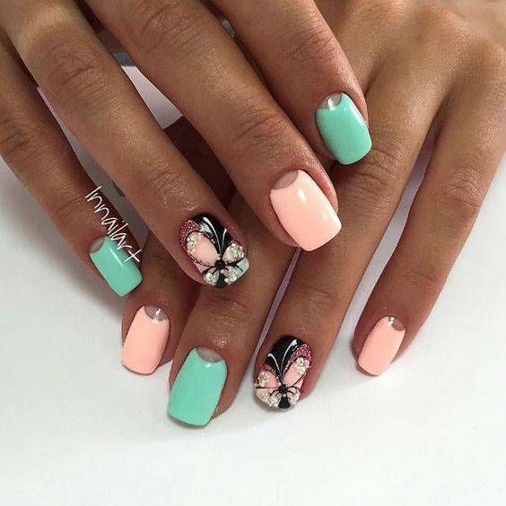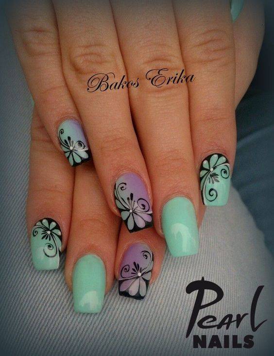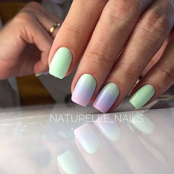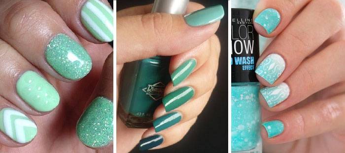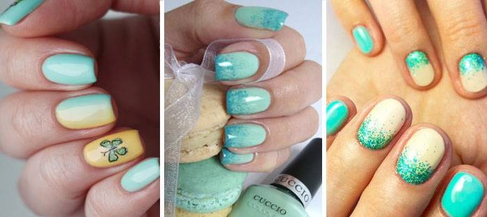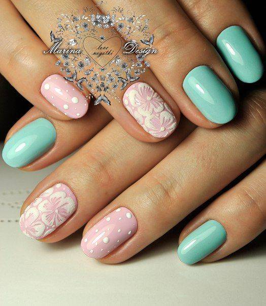 Нежные пастельные оттенки выглядят крайне женственно и эстетично. Модный мятный дизайн достаточно разнообразен, он представлен в классическом варианте, в технике омбре, в сочетании с различными рисунками и украшениями.