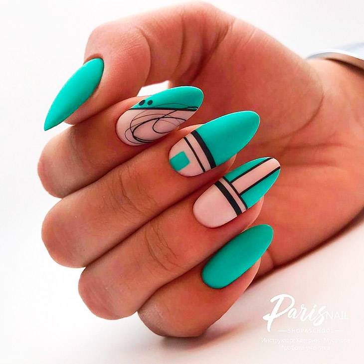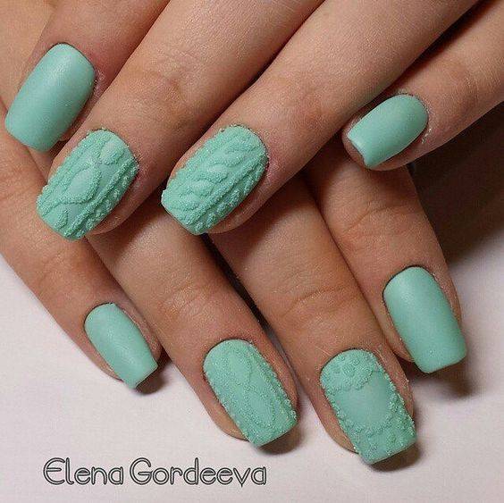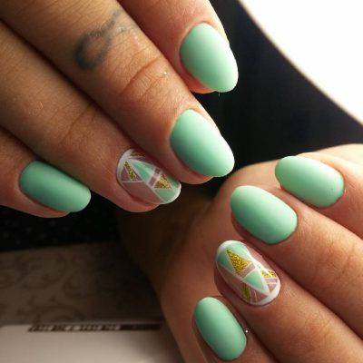 Матовый вариант выглядит крайне утончённо и оригинально. Такой дизайн получается при нанесении матирующего покрытия на любой гель-лак либо шеллак. Матовый мятный цвет визуально очень эффектный. Он великолепно сочетается с глянцевыми узорами тоже же оттенка.