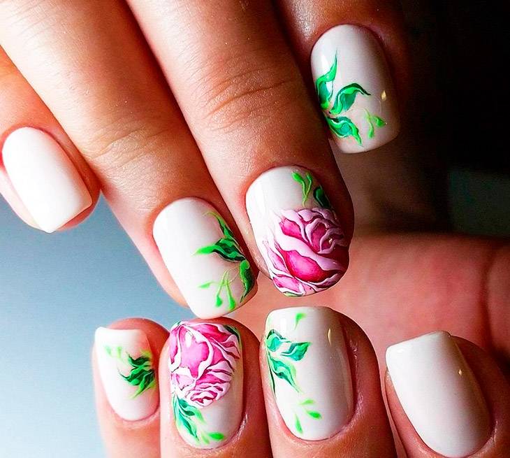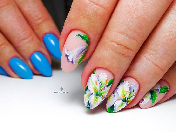 Если вы пока не готовы к арт-экспериментам, возьмите на заметку этот классический образ с веточкой цветка. my.semi.nails