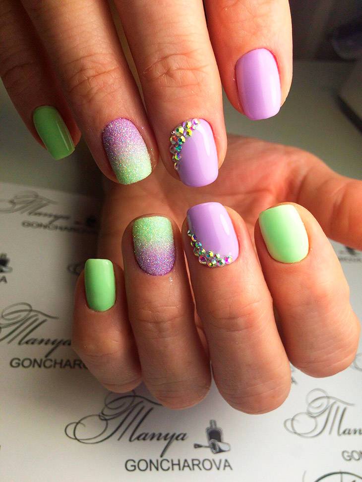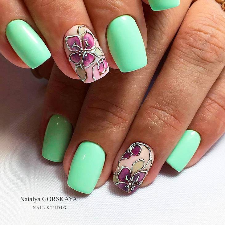 Как и голубой, светлые оттенки фиолетового хорошо вписываются в мятный маникюр с дизайном. Цвета комбинируют в создании геометрических фигур, градиента, а также абстрактных изображений в виде мазков.