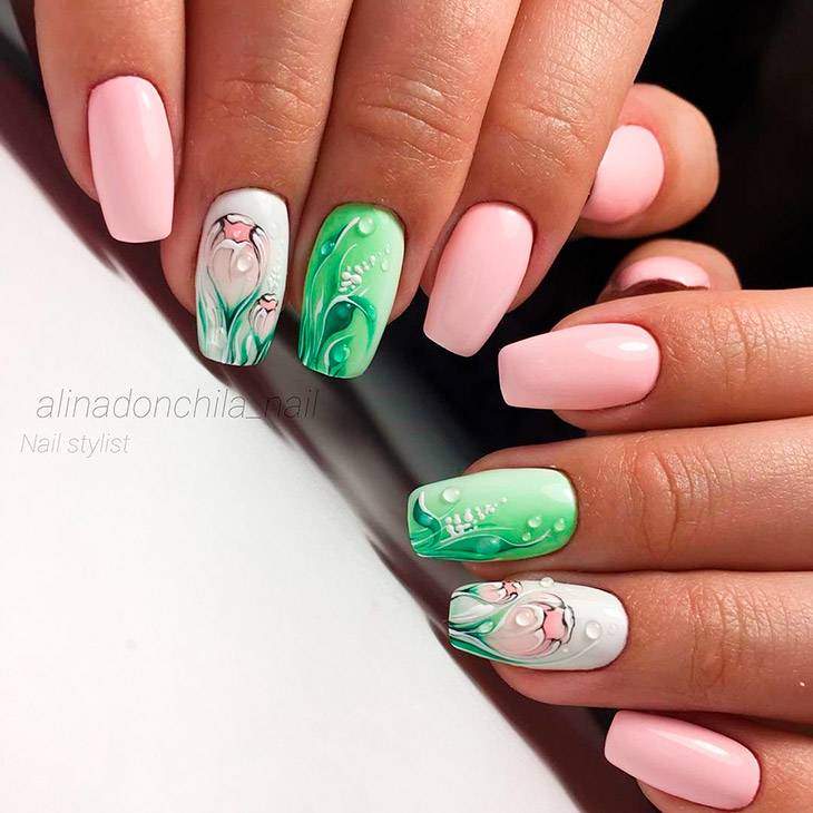 Экстравагантный дизайн или нежный образ с миниатюрным рисунком? Примерьте все три варианта мятно-розового маникюра из нашей галереи!