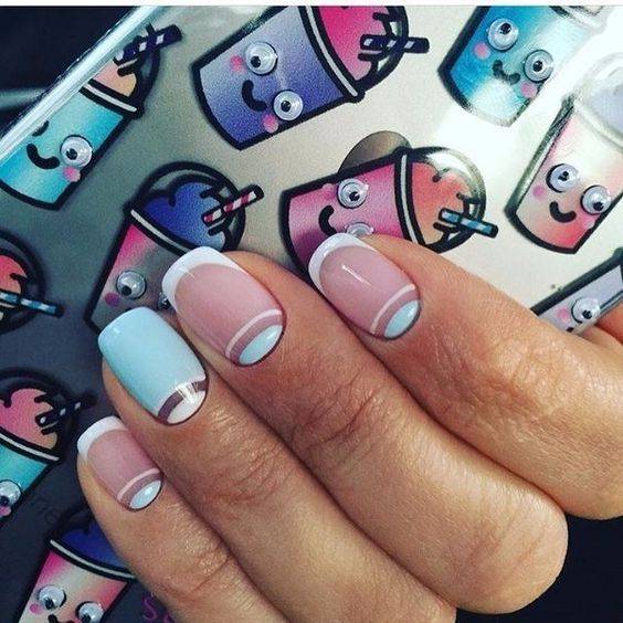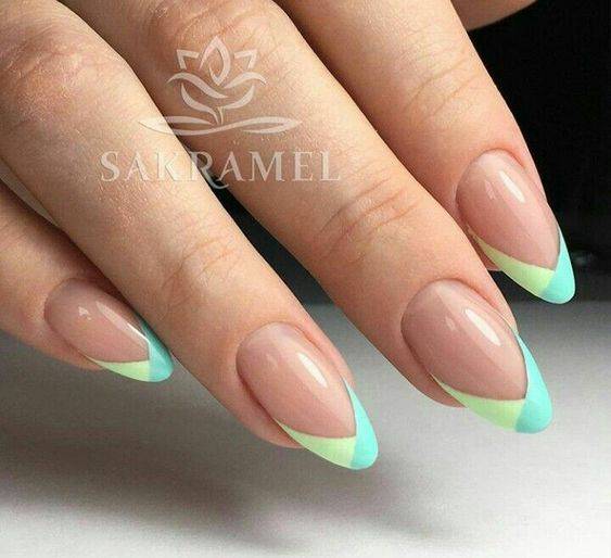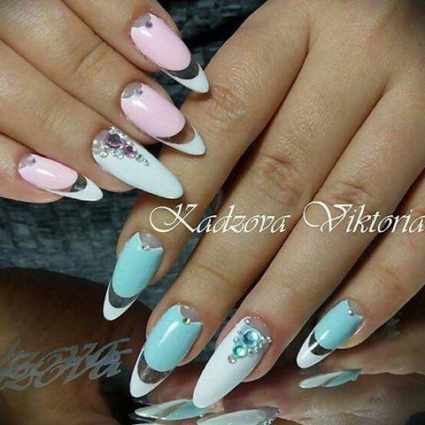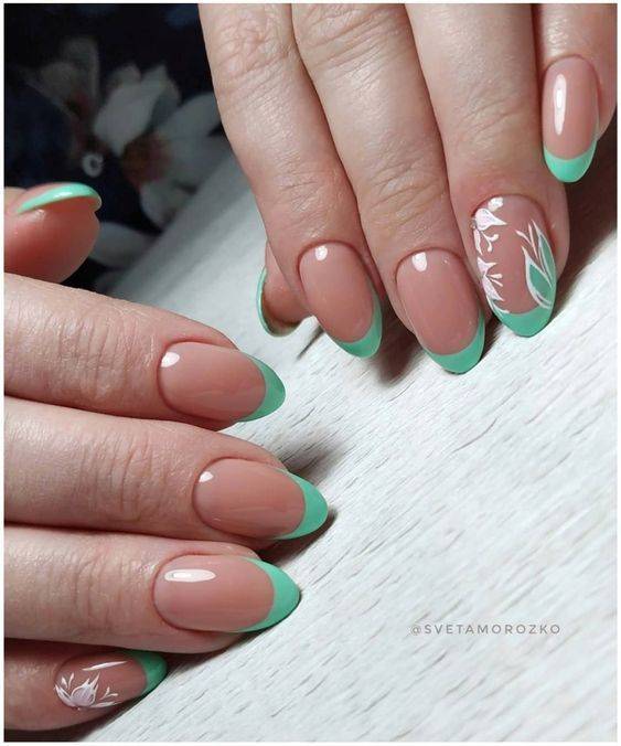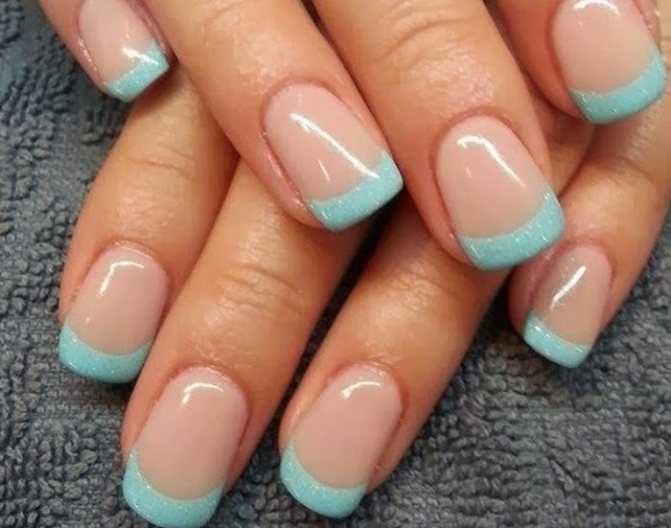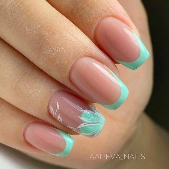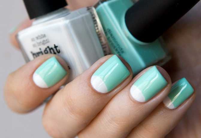 Двухцветный маникюр в мятных тонах может быть выполнен в самых разных вариантах. Это может быть элегантный френч. Если для второго цвета можно выбирать разные лаки. Если это будет белый цвет, то нейл-арт получится сдержанным и элегантным, но в то же время свежим и ярким.