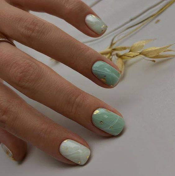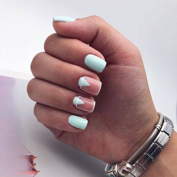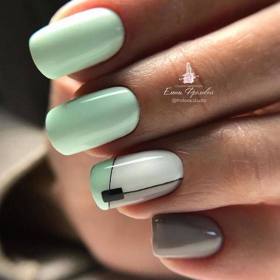 Мятный хорошо сочетается с нейтральными оттенками, которые придают особую изящность, а также часто используются как фон для нейл-арта. При помощи белого и молочного наносят геометрические узоры, создают омбре, френч и лунный маникюр.