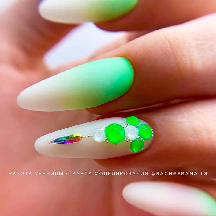 Такой маникюр можно завершить узорами либо декором. Изящно смотрится омбре с матовой поверхностью. Градиент подходит для любой длины ногтей.