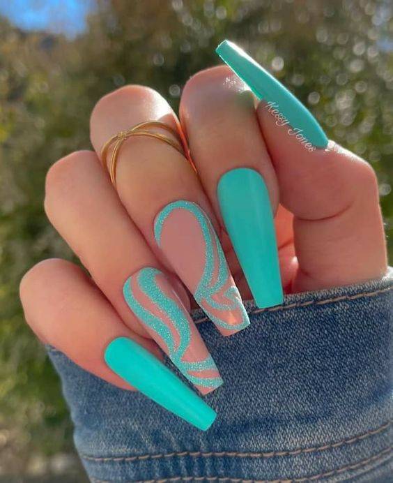 Если вам скучно носить однотонный нейл-арт, а на выполнение сложного бирюзового маникюра у вас нет времени, то отличным вариантом станет украшение, нанесенное на один палец. Такой способ оформления пользуется большой популярностью, ведь этот модный нейл-арт имеет оригинальный вид, а на его осуществление уйдет минимум времени. Наносить дизайн допускается на любой палец, но лучшим решением станет украшение ногтя безымянного пальца. Объяснение простое – он меньше всех участвует в повседневных делах.