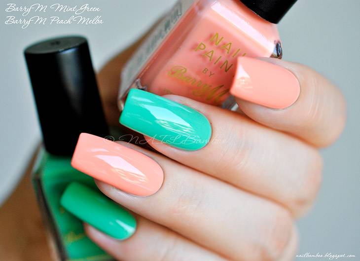 Яркие мятные лаки лучше сочетать с такими же яркими цветами (фиолетовым, синим, коралловым, кофейным), а вот светлые мятные оттенки будут хорошо выглядеть рядом с пастельными тонами (нежно-розовым, белым, сиреневым). Ниже мы представляем четыре самых эффектных сочетания в мятном маникюре.