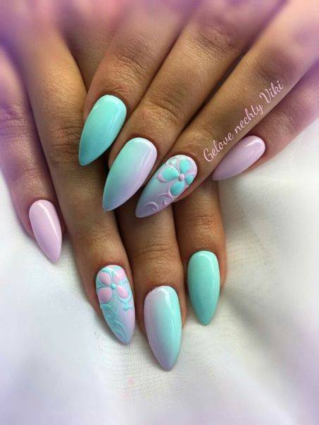 Светлый однотонный вариант оформления подчеркнет невинность и духовную чистоту. Теплые мятные тона подойдут спокойным девушкам. А яркие ногти, украшенные всевозможными узорами, идеально подчеркнут образ и добавят к нему изюминку.