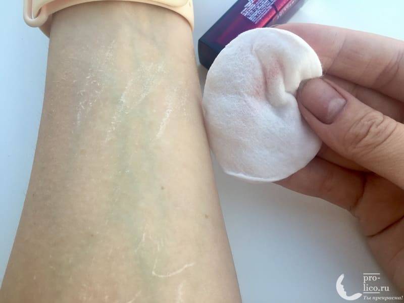 Ради теста, я решила смыть свотч помады при помощи мицеллярной воды Garnier «Чистая кожа». Как и положено, я смочила ватный диск, приложила к месту нанесения и подержала 20 секунд. После этого вытирающим движением провела в сторону.