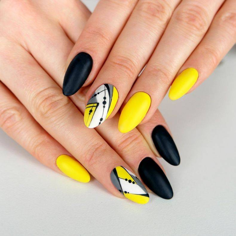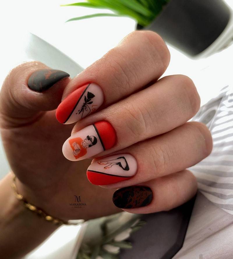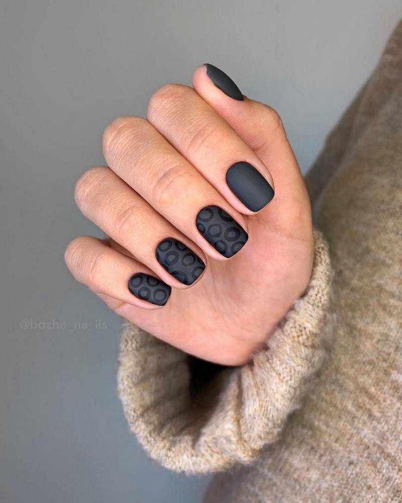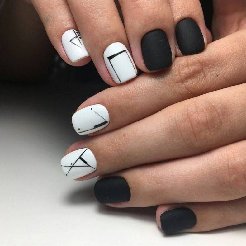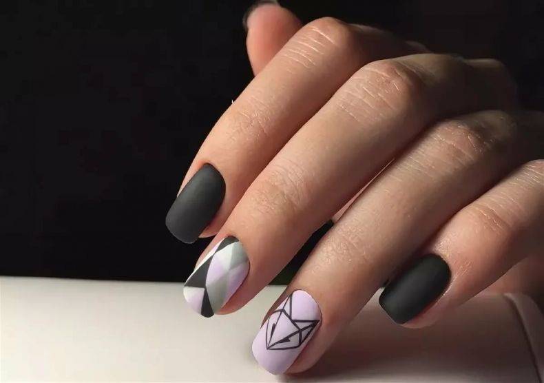 Стильно смотрится на матовых аккуратных ногтях и геометрия, особенно на коротких, тщательно обработанных ногтях. Такой необычный матовый маникюр в темных цветах можно носить даже на работу, разбавив его при этом, контрастными цветами, к примеру, нюдовыми или даже белым.