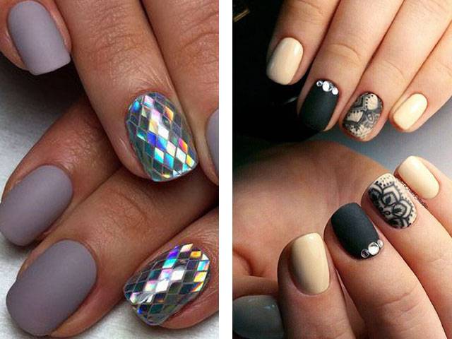 Вариантов дизайна на основе матового маникюра очень много, главное — проявите свою фантазию и используйте разные декоративные приемы. К примеру, на матовой поверхности можно прорисовать узоры прозрачным лаком, сделать классический и обратный французский маникюр, выделить акценты блестками или стразами.