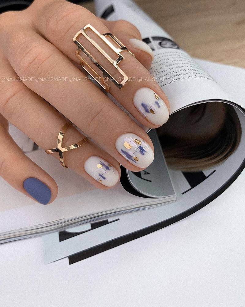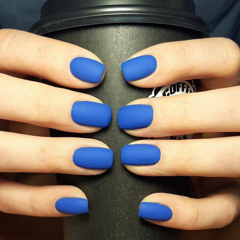 Очень красиво смотрится в матовом варианте матовое покрытие синего цвета. Очень оригинальное и свежее решение 2024 года. Синий просто волшебен в матовом решении. И смотрится просто магически! Можно выполнить синий матовый французский маникюр, украсив безымянные пальчики лаковыми элементами. А еще можно сделать лунный маникюр, сделав лунки матовым, или наоборот, глянцевым покрытием, а основу оставить классической.