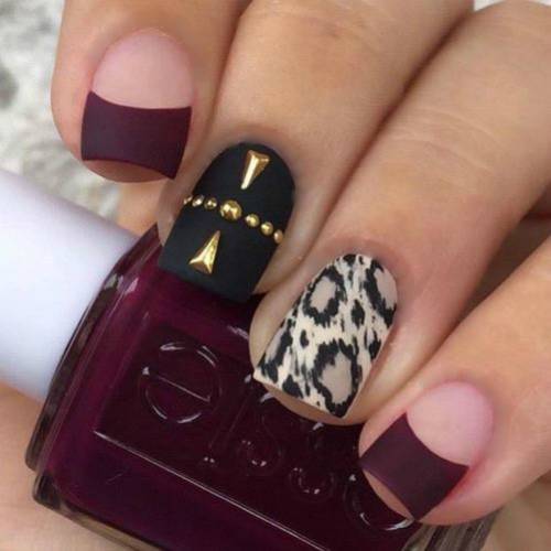 Насыщенный матовый бардовый в совокупности с черным оттенком – бесподобное сочетание. Золотые декоры, которыми составлен рисунок, прекрасно вписываются в общую картину. А благодаря пятнистому стилю создается контраст образов.