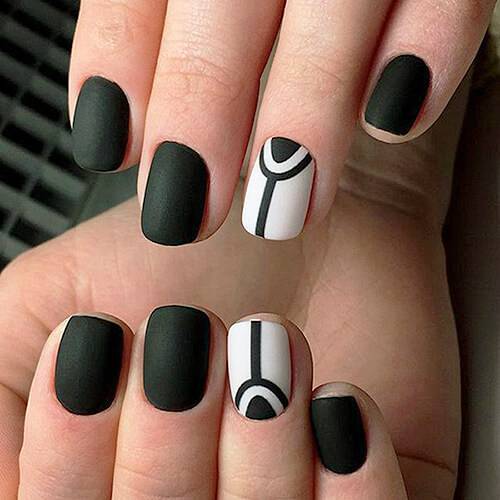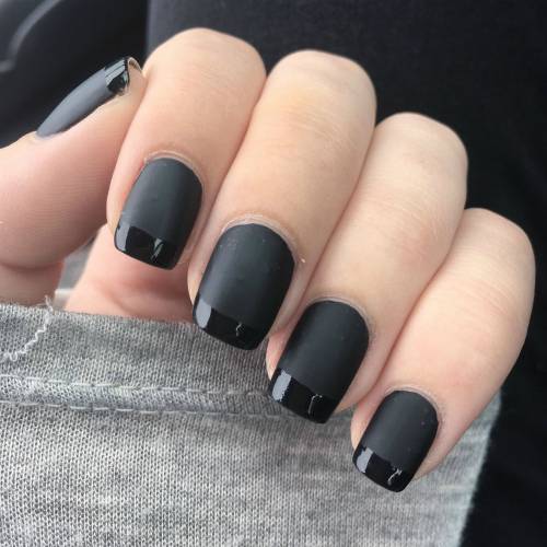 Разнообразные дизайны гелевого matte покрытия в черных цветах не перестают удивлять. Необычное выражение классического лунного маникюра представлено на фото. Вместо изогнутой линии нанесена прямая. Также присутствует дополнительная линия, обрамляющая основание ногтя, подчеркивающая изгибы.