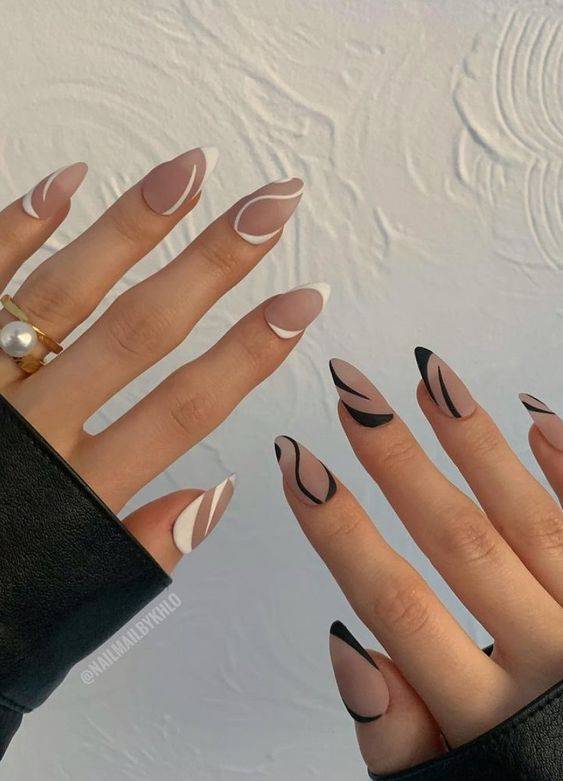 Зигзаги, точки, френч – каждый ноготь можно украсить по-разному. Чем разнообразнее будут узоры, тем интереснее будет ваш маникюр в темных матовых тонах.