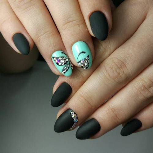 Еще один вариант со стразами. В данном варианте черные стразы дополнительно подчеркивают весь шарм черного цвета, привлекая своей игрой цвета на свету.