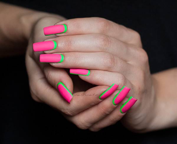 С короткой длиной стоит быть осторожным. Матовая текстура совершенно не бликует, не отражает свет. Поэтому часто ноготки кажутся гораздо короче, чем это есть на самом деле. Визуальное укорочение пластины делает пальцы и руки менее изящными. Рекомендуется выбирать светлые и яркие оттенки для короткой длины. Кроме того, не стоит перегружать их декором. Достаточно небольшого акцента — вертикальной полоски, визуально вытягивающей ноготь, пары мелких страз для выделения лунки, геометрического минималистичного рисунка.