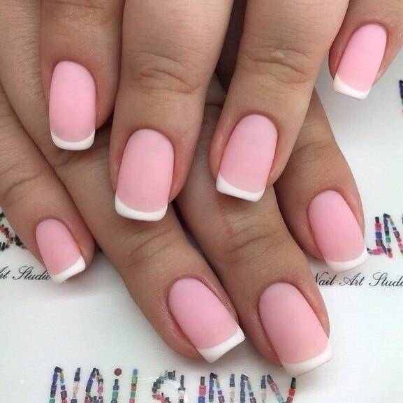 Традиционное исполнение простейшего французского матового маникюра, к которому мы все привыкли, – это белый кончик отросшего ногтя и прозрачное заполнение всей ногтевой пластины. Если по каким-то причинам вы не слишком довольны цветом своих ногтей, или на них есть небольшие дефекты, можно покрыть ноготь предварительно нежно-розовым, бежевым или телесным цветом, имитирующим здоровый и красивый оттенок.Так же можно белый лак заменить любым другим цветом лака.