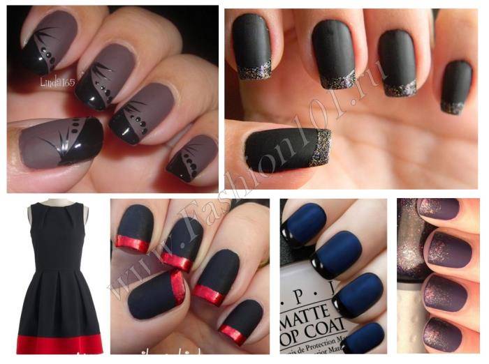 Наиболее практичным и удобным способом является выполнение маникюра с матовым лаком. Покрытие получается гладким и внешне напоминает бархат. Особым шиком отличается матовый лак для ногтей черного цвета. Чтобы сделать эффектный маникюр с черным матово-глянцевым дизайном, вам понадобятся: