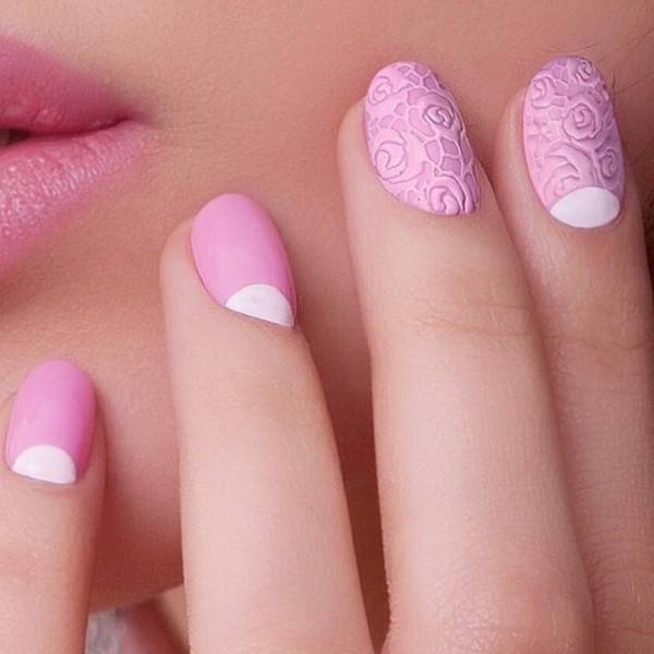 Розовый цвет очень нежный, а матовость придает ему еще больше романтизма. Как и другие цвета, матовый розовый продается во множестве оттенков, которые позволяют создавать различные варианты маникюра. Особенно красиво смотрится розовый с белым, при этом наносить второй оттенок можно как на лунулу, создавая лунный маникюр, так и на весь ноготь, чтобы выделить какой-то из них.