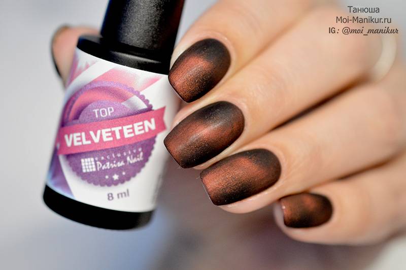 Бархатный топ подходит к любой форме и длине ногтя. Главное — выбрать подходящий оттенок лака. Он должен сочетаться с цветотипом модницы и обладать свойством делать пластину ногтя более изящной.
