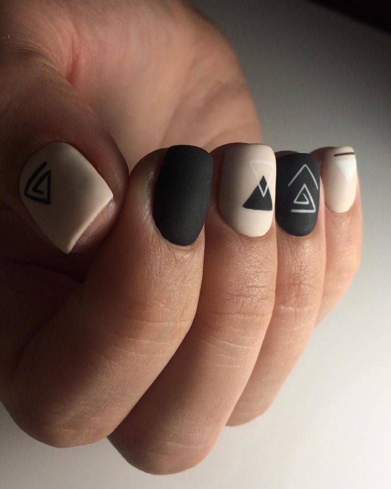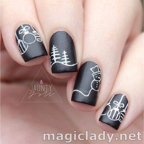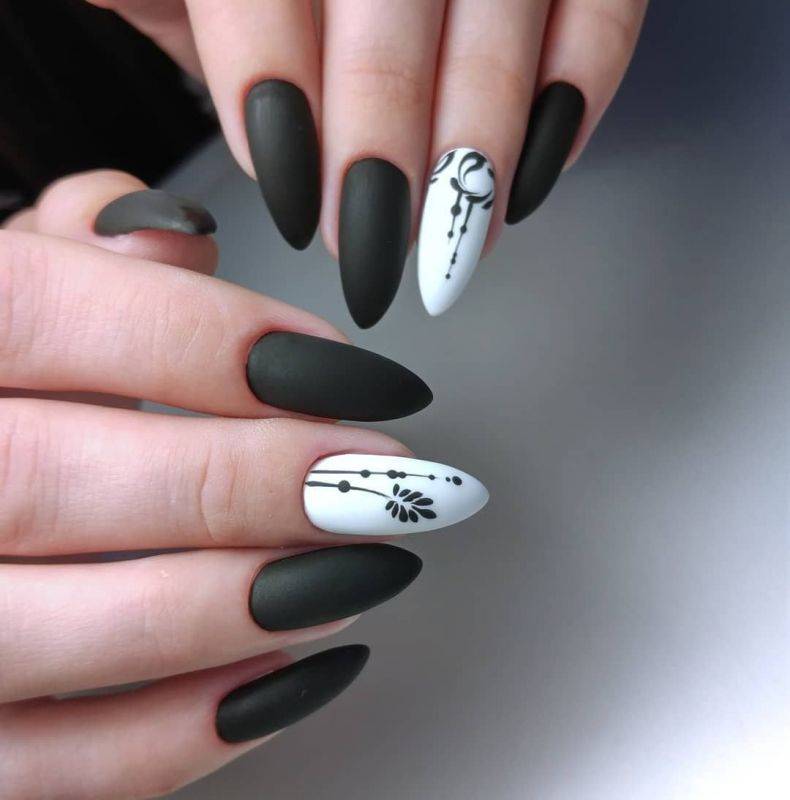 Зигзаги, точки, френч – каждый ноготь можно украсить по-разному. Чем разнообразнее будут узоры, тем интереснее будет ваш маникюр в темных матовых тонах.