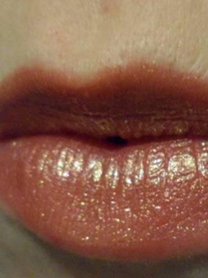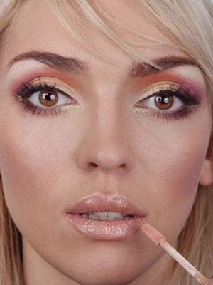 Помадой бежевого цвета закрашиваем изначальный цвет губ, наносим оранжево-золотистый блеск по контуру.