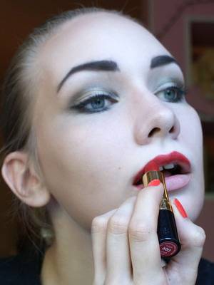 Берем кисточкой розово-красную помаду с легким синеватым оттенком, мягко прорисовываем контур губ. Как верхнюю, так и нижнюю губу делаем чуть толще.
