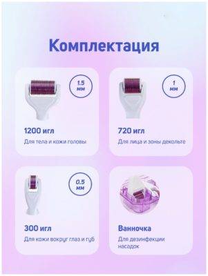 Практичный комплект 4в1 включает в себя несколько насадок, которые дают возможность использовать одно устройство на разных частях тела. В комплект входит прибор с иглами 1 мм для лица и головы, а также еще две насадки – с более длинными иглами для массажа по всему телу и маленький роллер для деликатной зоны возле глаз.