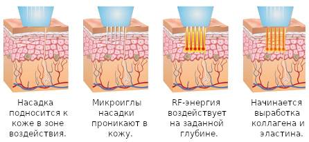 Эта процедура работает путем доставки радиочастотного слоя вглубь кожи с использованием уникальных неизолированных игл и технологии фракционного импульсного режима. Проще говоря, действие микроигл стимулирует выработку собственного коллагена кожи, для устранения шрамов и морщин, а так же уплотнения и улучшения качества кожи.