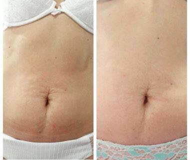 На первой фотографии заметен визуальный эффект уже после первой процедуры рф-лифтинга живота через месяц, на второй — фото после курса из трех процедур: