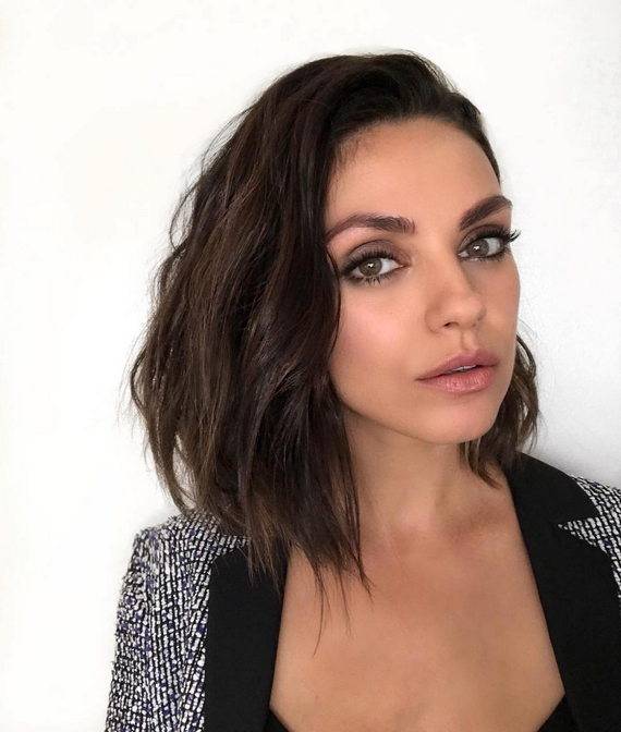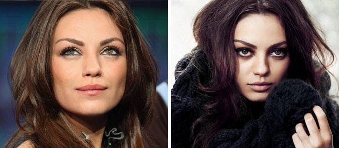 - Макияж, как у Милы Кунис, предусматривает нанесение теней шоколадного оттенка на складку, внешний уголок глаза и немного выше подвижного века.