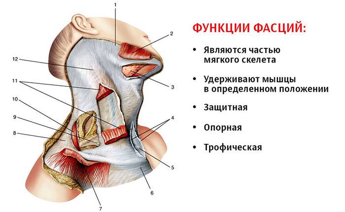 Фасции этой зоны многочисленны. Они образуют футляры и влагалища для мышц, выступают как крепежный элемент, соединяющий мышечную ткань с отростками позвонков и основанием черепа, а срастаясь, образуют белую линию шеи.