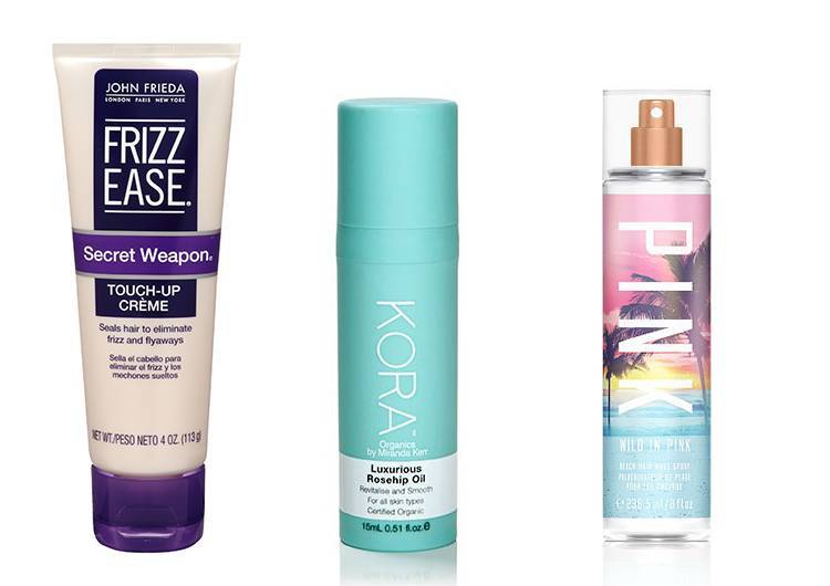 Крем для укладки Frizz Ease Secret Weapon Crème, John Frieda; масло Luxurious Rosehip Oil, KORA Organics; спрей Beach Hair Wave Spray, Victoria’s Secret