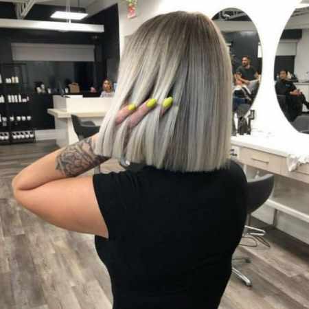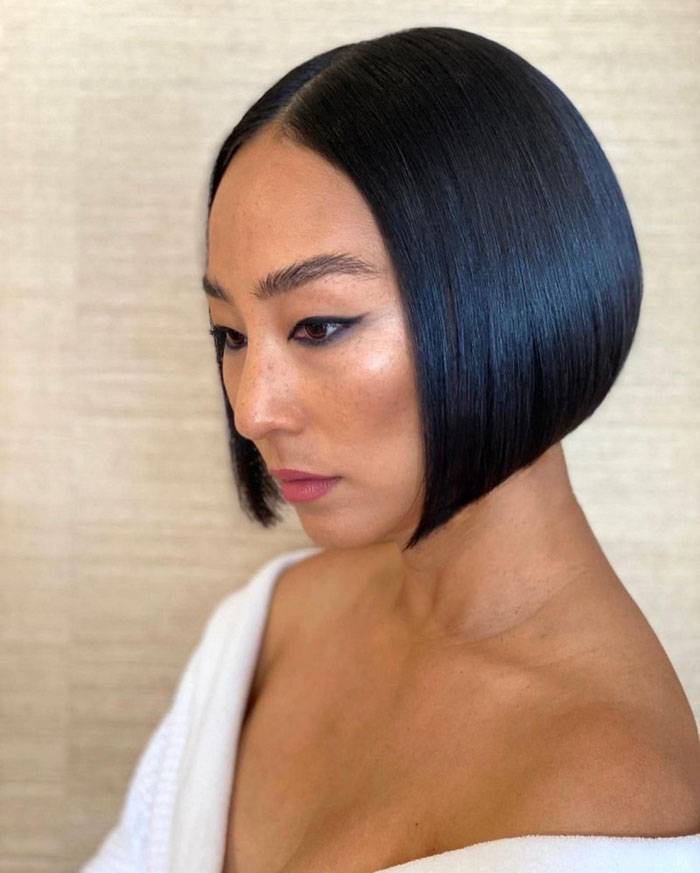 Стрижка подходит для средней длины, прямой или слегка волнистой текстуры. У нее нет возрастных ограничений. Элегантно смотрится при наличии седины. Этот вариант — находка для обладательниц плоского затылка.