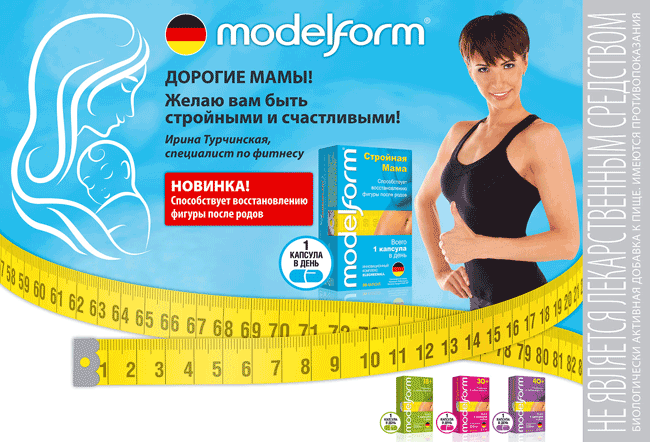 Не так давно был выпущен Модельформ «Стройная мама» — инновационное средство для похудения женщин в послеродовой период. При создании уникальной формулы учёные учли все особенности физиологических процессов, протекающих в теле роженицы на протяжении 18 месяцев (1,5 года) после рождения малыша. Препарат восстанавливает и защищает женский организм после родов и лактации. С его помощью вполне возможно привести фигуру и массу тела к состоянию «до беременности».