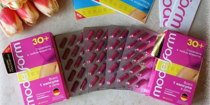 Выпускается Модельформ в виде капсул. Упаковка состоит из 2 пластин, каждая из которых содержит 15 таблеток. Благодаря специальной желатиновой оболочки, происходит быстрое растворение средства в желудке, а его активные компоненты лучше усваиваются, обеспечивая максимальное воздействие на организм.