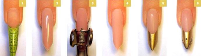 Далее необходимо укоротить наклеенные типсы на необходимую вам длину. Пользоваться нужно только типсорезами, они не расколют типс и оставьте обязательно пару миллиметров на опил ногтей, впрочем, если у вас большой опыт можно и меньше, меньше оставите, меньше будите мучить себя и ногти, надежней получится.