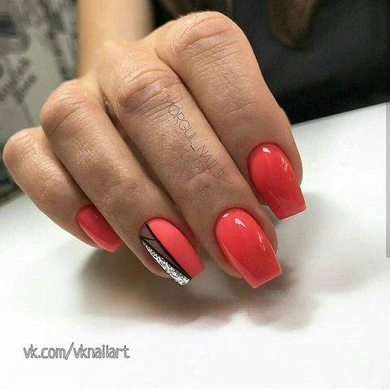 Этот просто универсальный и модный маникюр подходит как для повседневной жизни, так и для торжественных случаев. Самый лучший вариант – это алый лак на ногти средней длины. Можно сделать интересные акценты в виде серебра и золота на одном ногте.