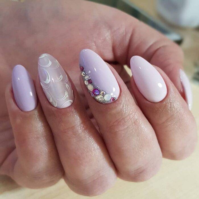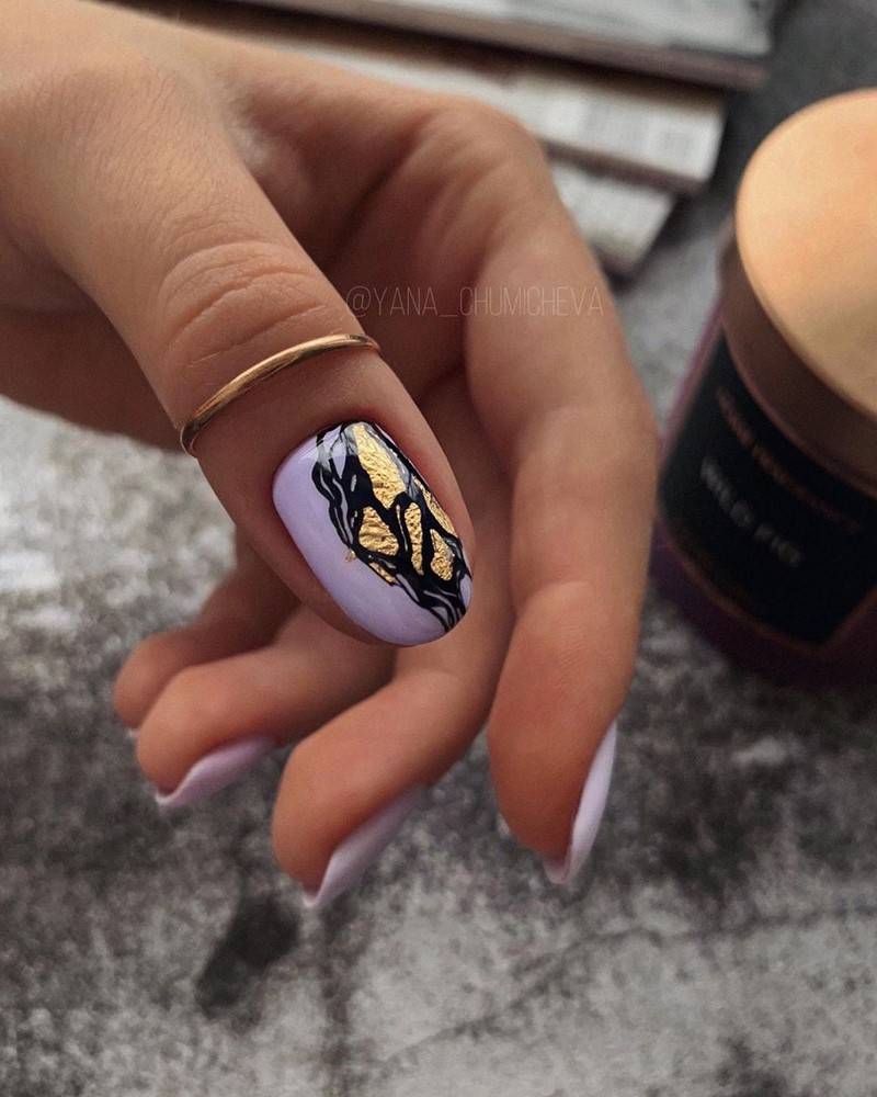 Цветовая палитра Very Peri продолжает оставаться популярной. Оттенки представлены в фиолетовых, лиловых, сиреневых вариациях. Нейл-арт можно сделать в монохромном исполнении или прибегнуть к нанесению интересных рисунков. Гармонично смотрятся тематические принты в виде фиалок, лаванды. При их создании можно обратиться к прорисовке лаком или выполнить декор в объемном виде. Последнее можно воплотить с помощью техники лепки, подходящей для изображения крупных лепестков. Мелкие цветочки выложите бусинками.