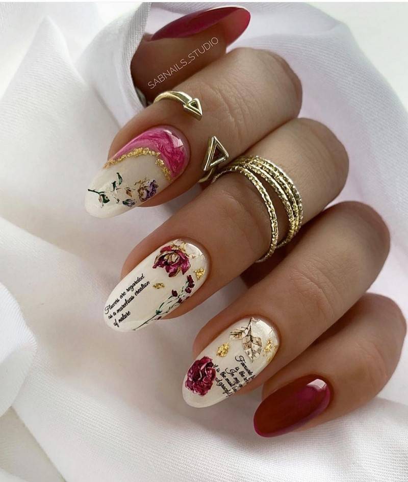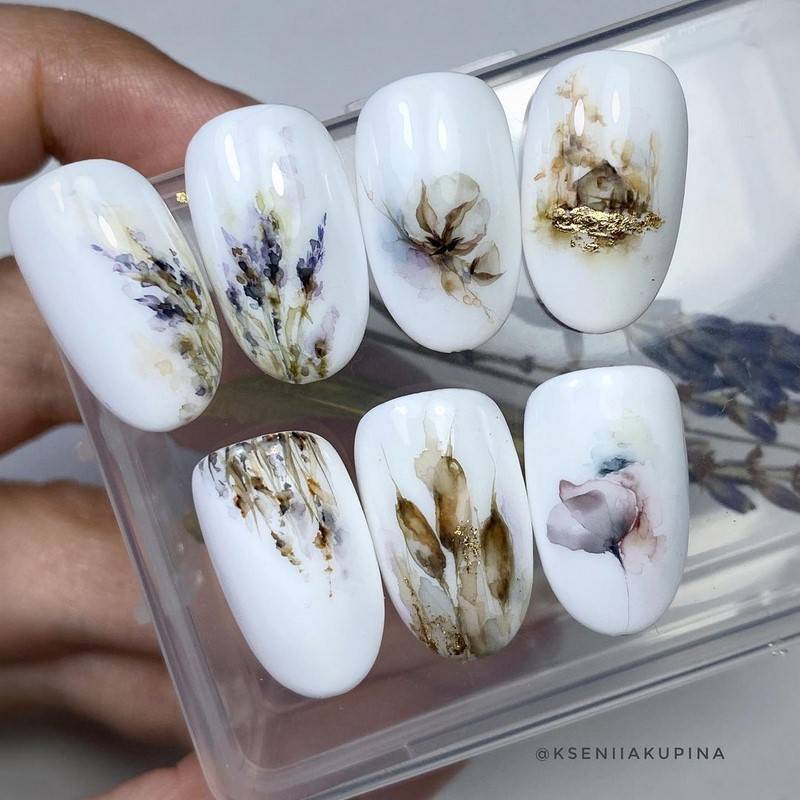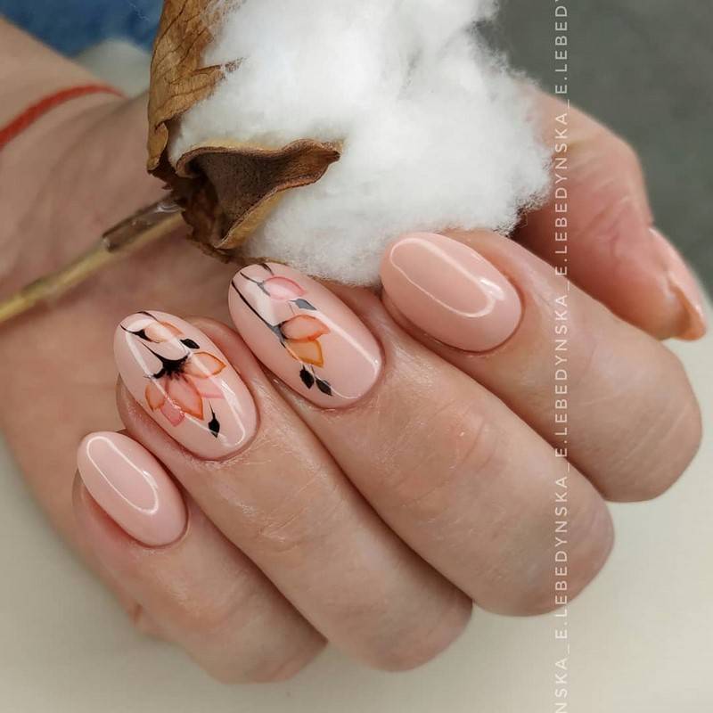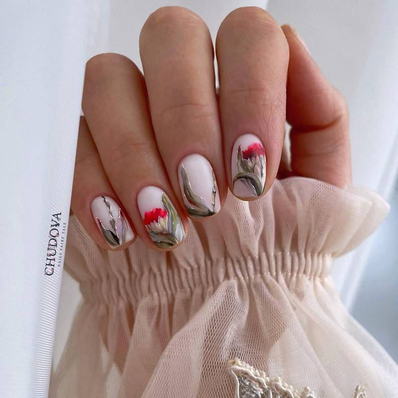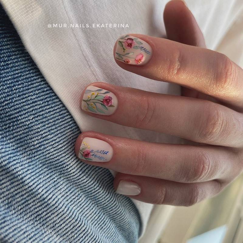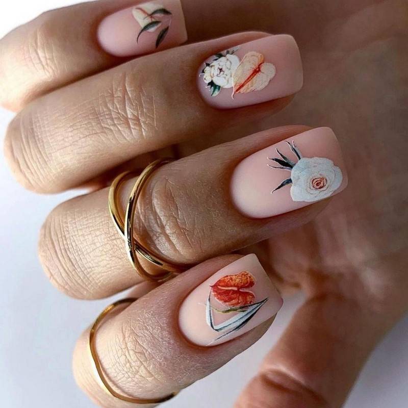 Флористические узоры привносят в дизайн освежающие нотки. Рисунок получится максимально реалистичным, если будет выполнен в технике акварели. При желании упростить процесс создания нейл-арта можно прибегнуть к нанесению готовых наклеек с цветочными узорами. Орнамент выполняют в технике лепки, выложив лепестки, которым придают объемный эффект.