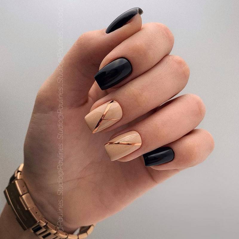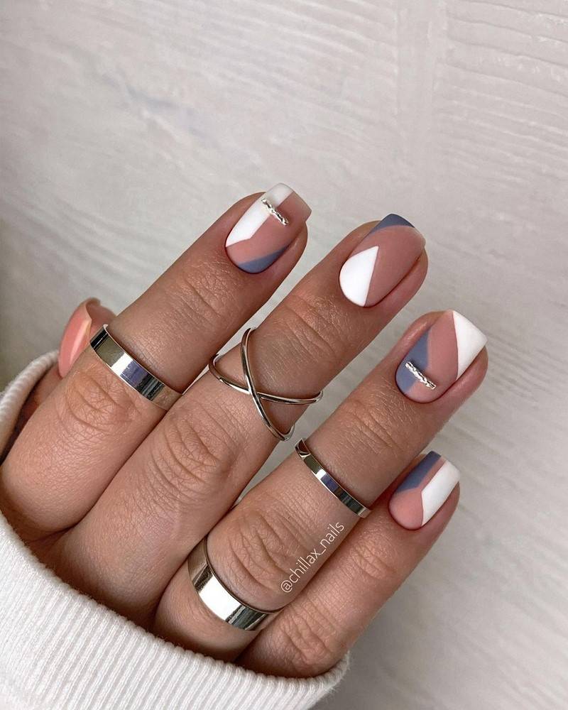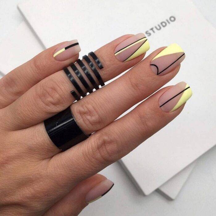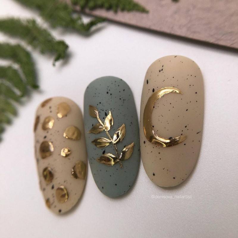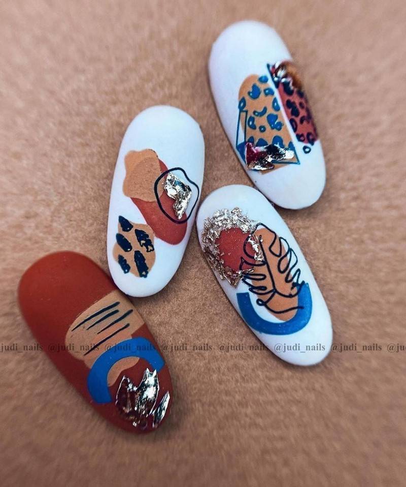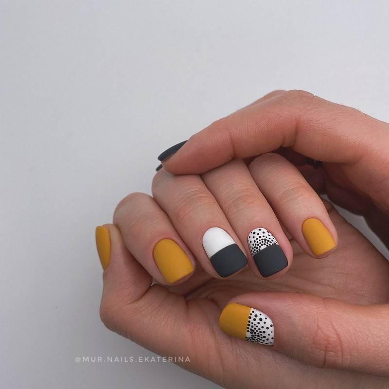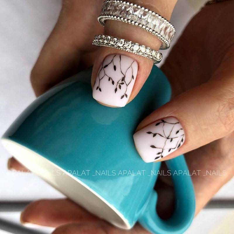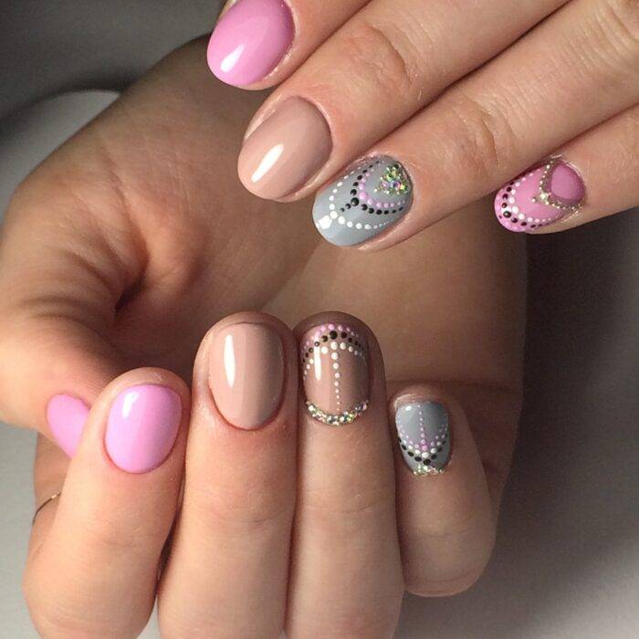 Самой удачной техникой в данном случае будет геометрия. Необычные фигурки разных размеров и форм придадут вашим рукам нотку стиля. Нейл-мастера рекомендуют использовать не более трех оттенков и пару фигур или линий, расположенных в разном направлении. Также в этом дизайне актуальны точки, цветочные узоры, веточки и аккуратные завитушки.